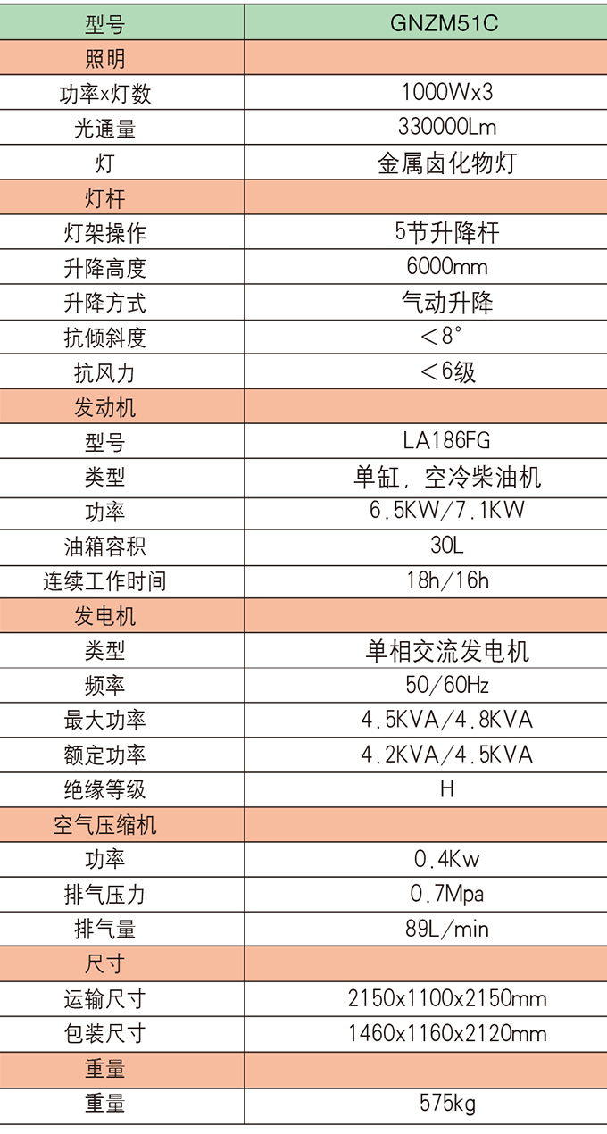 沃尔华GNZM51C气动升降拖车式照明车基本配置