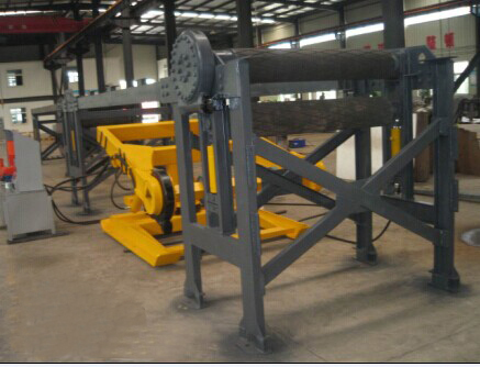该装置布置在伸缩带式输送机贮带仓的后方,整套设备的动力均由液压泵站提供。当贮带仓贮满输送带时,先通过固定夹带装置把皮带夹住,防止皮带跑掉,当卷带完成皮带接头连好后才能松开。抽带机构由液压马达带动上滚筒转动,下滚筒由两个液压油缸支起,将皮带压在上下滚筒之间,随着液压马达不断的转动,皮带就松弛下来,此时将皮带接头拆开,就可以进行卷带,卷带结束后,支承下滚筒的液压油缸松开,下滚筒复位。卷带机构由液压马达带动,卷带力大,速度可控,可卷带长120米左右,摇臂可上下左右摆动以保证卷带整齐,并可实现180°内旋转把卷好的皮带移出皮带机架。