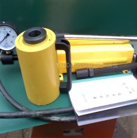 2、使用前装上压杆,旋紧手轮,旋开排气阀,然后揿动压杆,使液压油通过高压胶管轮入空心油缸内。使油缸上升10MM左右,然后旋松手轮,使油缸复位,反复数次,使缸内空气排完。