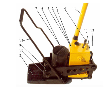 主要操纵结构图示:1操纵把2双柱塞泵3安全阀4回油阀杆5油箱6油缸7活塞杆8机座9起道轮10起道杠杆托板11连杆12助力孔座13提梁等组成。其液压原理图、主要结构如图示: