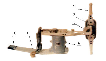 基本结构:1手把、2弹性把座、3调整板、4电机壳、5镐板、6捣固爪