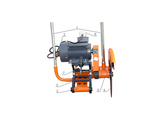 3、将切轨机装在钢轨上,拉出安装在卡具5上的定位杆,此时定位杆端面指示的位置即是砂轮切割位置,根据需要移动切轨机至预先设定的切割位置。然后使卡具内面(凸面)与钢轨顶面、轨腭下部贴紧,旋紧紧定螺栓,切轨机处于工作状态。